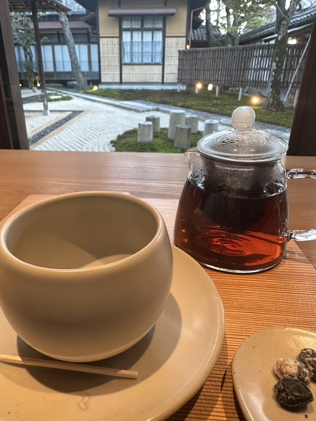 そんな中、素敵なカフェに伺いました。自然が多い道を抜けて向かうと、そのお店のまわりには、たくさんの人だかりがみえました。 中に入ると、歴史を感じる建物の中に、洗練された店内に驚きました。 古い物を大切にしながら、新しい物を取り入れている素敵な空間でした。 温かい黒豆茶と黒豆のお菓子をいただき、温かく、優しいお味に癒されました。
